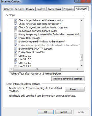 - Go to Advanced tab and scroll down for Security Category,there if you want to enable/disable the feature you can accordingly check the box captioned “Enable SmartScreen Filter” then press OK.